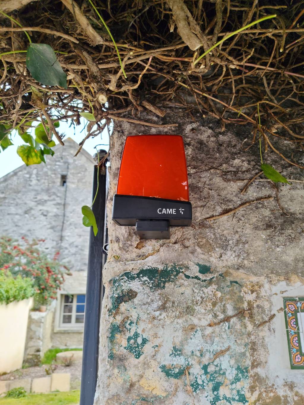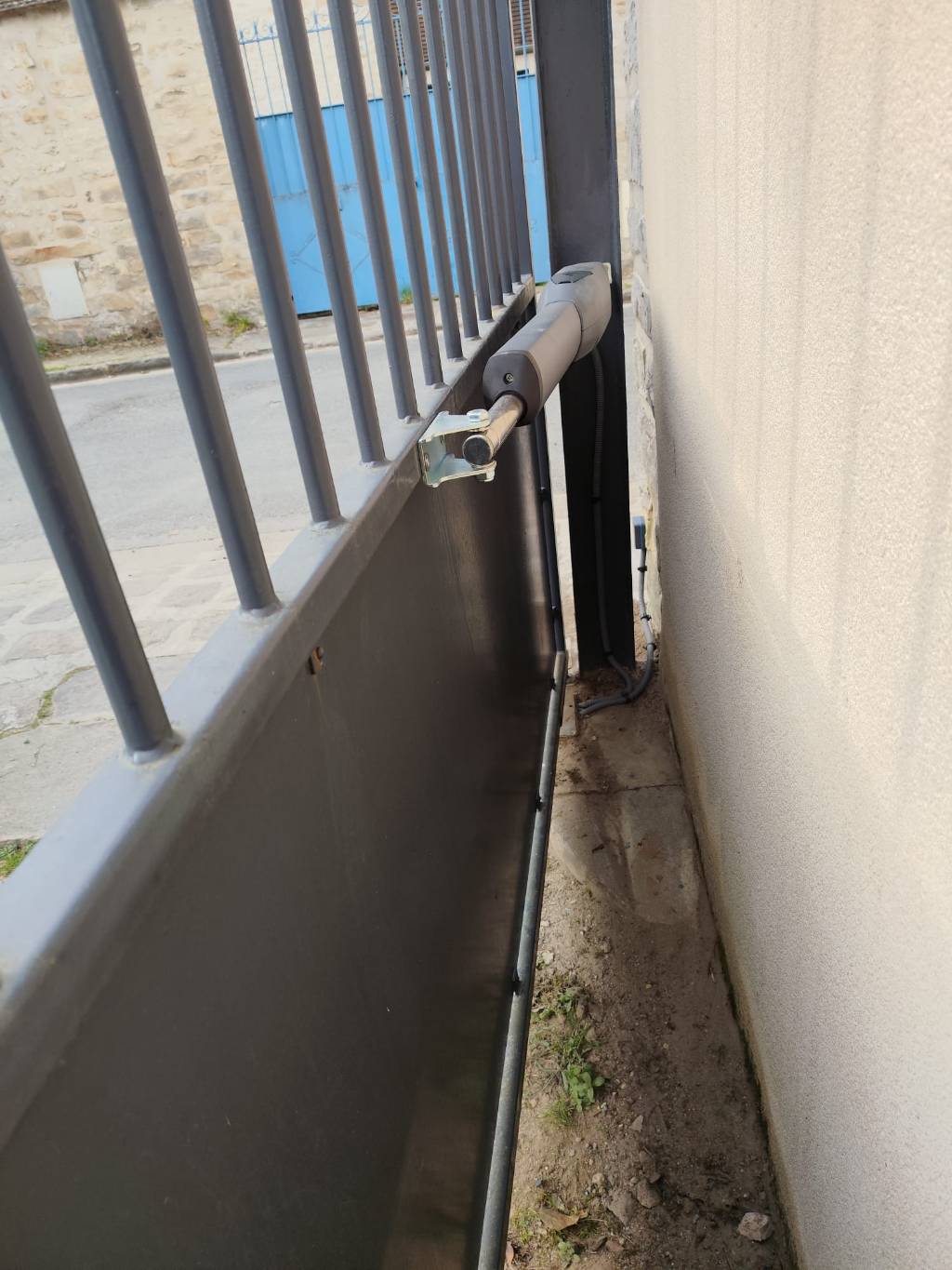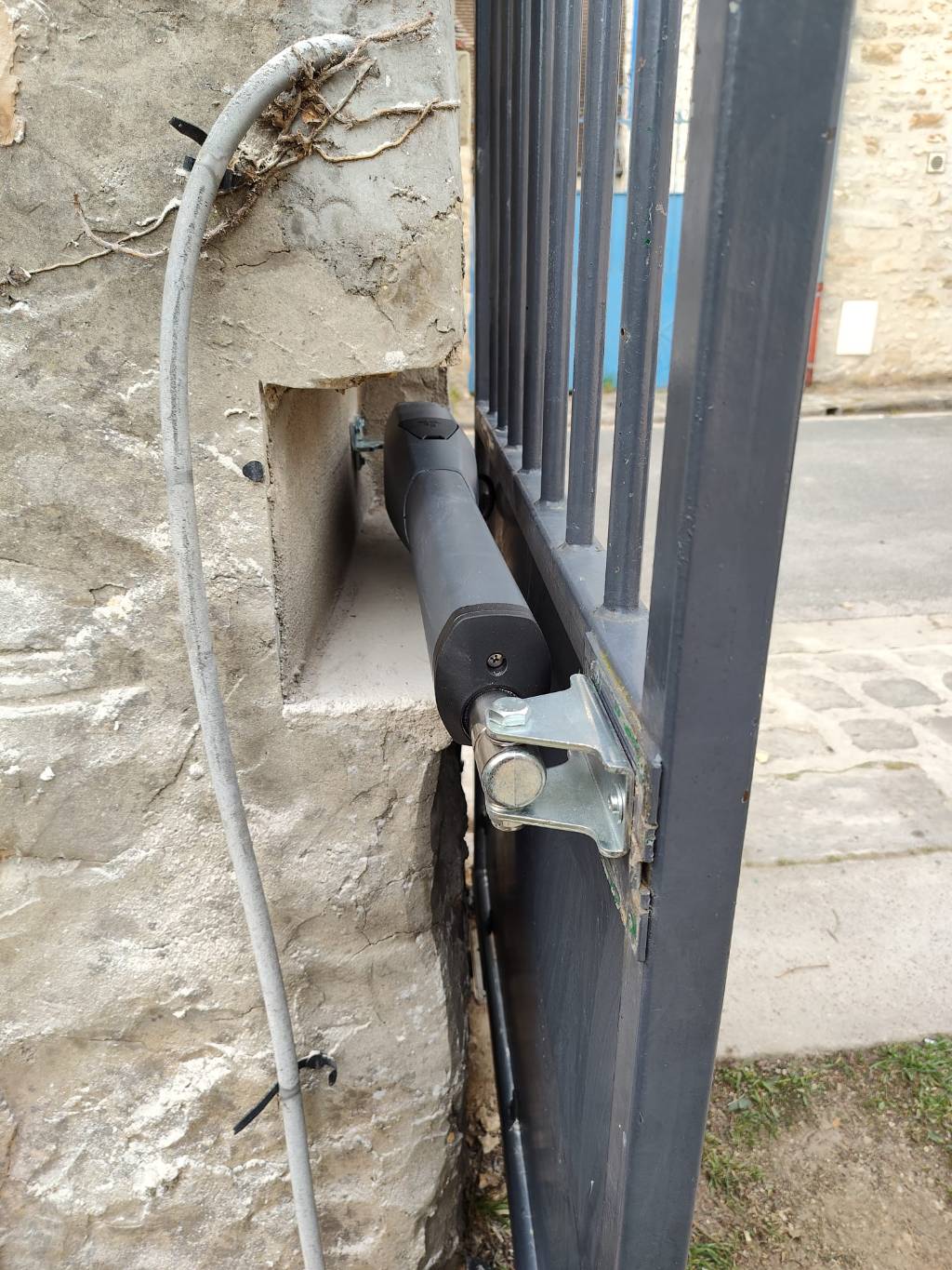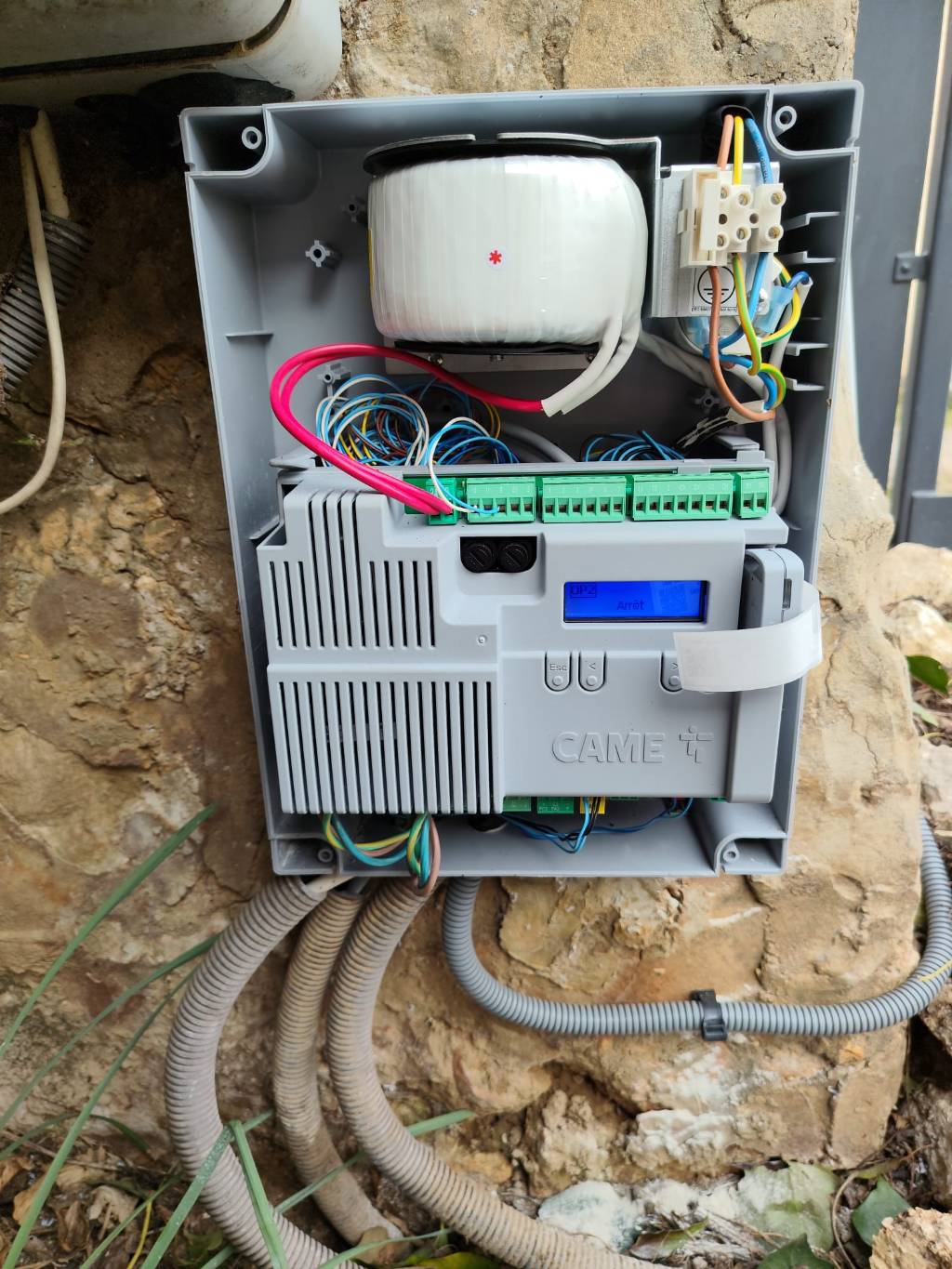 A la vue du coût financier des modifications de terrassement à réaliser pour un nouveau système encastré dans le sol, conforme aux préconisations constructeur, nous lui avons proposé d'installer un kit à vis sans fin CAME ATS 24v en applique sur son portail, auquel a été ajouté un kit de batterie de secours, ainsi qu'une clé wifi connectée.